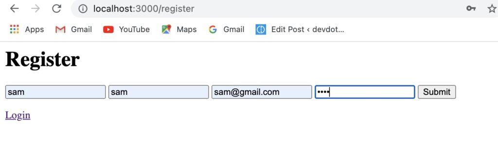 To log to the app, a user needs first to register or sign up by entering his name, email and password in the registration form on the register page. After that we need to store these informations as an object in a redis database using hashs.